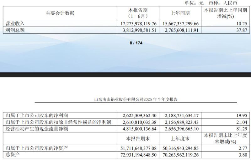 8月28日,南山铝业(SH600219)发布2025年半年报,上半年同比营收利润双位数增长。