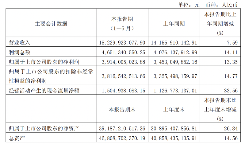 报告期内,海天味业营业收入为152.3亿元,同比上升7.6%;归母净利润为39.1亿元,同比上升13.3%;扣非归母净利润为38.2亿元,同比上升14.8%;经营现金流净额为15.05亿元,同比增长33.6%。