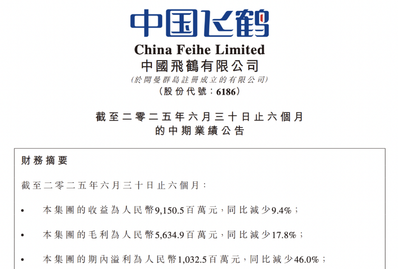 近日,中国飞鹤(06186.HK)披露2025年上半年业绩报告,实现收益为91.51亿元,同比下降9.4%;毛利为56.35亿元,同比减少17.8%;期内利润10.33亿元,同比下滑46%。