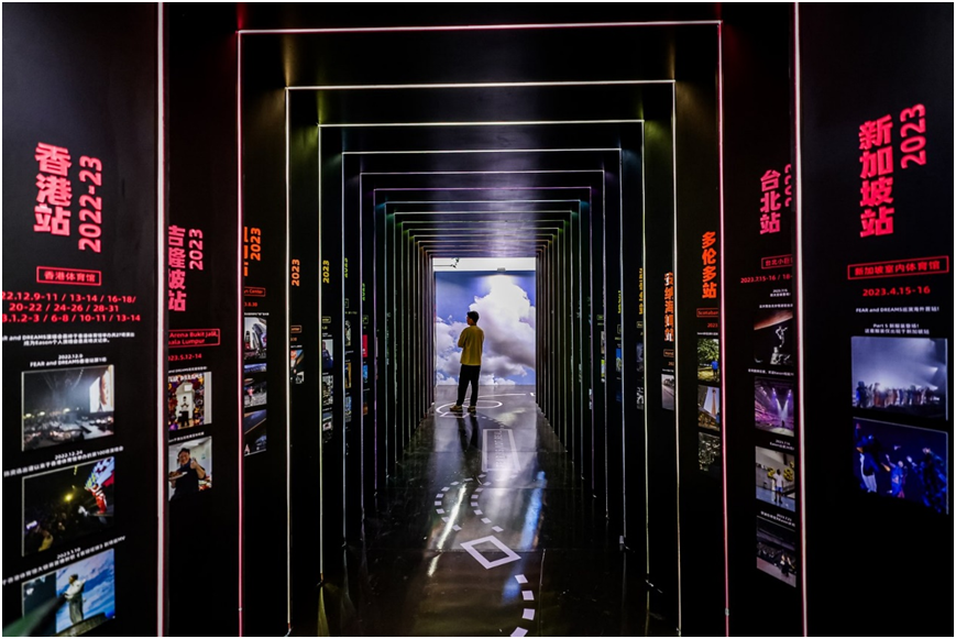 展览主要包含【环球足迹·时空隧道】及【沉浸式主题打卡区】两大展区,时空隧道展示「FEAR and DREAMS」巡演所踏足的33个城市站名及珍贵影像,「浮世·筑梦」镌刻着演唱会核心概念的主题墙,「任我·乘风」一蓝一红气球艺术装置及【心声回响·粉丝留言墙】等主题打卡。