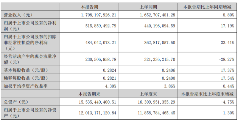 报告显示,华兰生物公司上半年营业收入为17.98亿元,同比增长8.80%;归母净利润为5.16亿元,同比增长17.19%;扣非归母净利润为4.84亿元,同比增长33.41%;基本每股收益0.28元。
