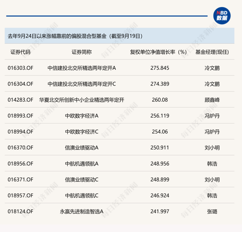 Wind数据显示,截至9月18日,从去年9月24日开始,已经有429只偏股混合型基金、112只普通股票型基金的区间业绩超过100%,主要来自投资实力较强的头部公募。