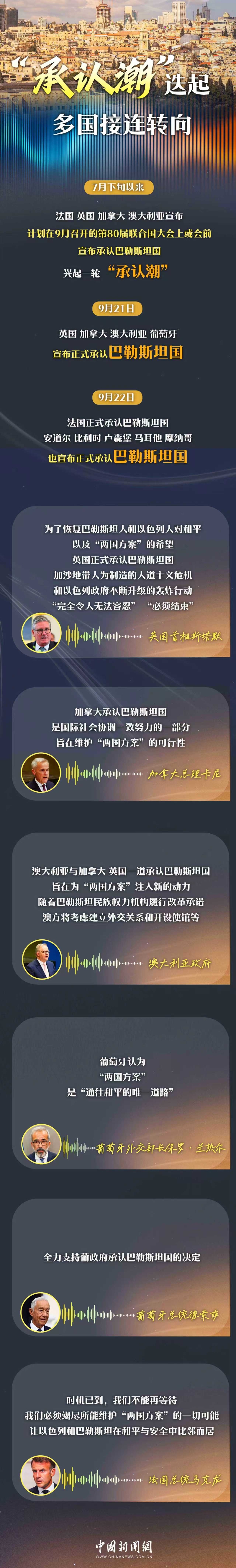 加沙战火未熄,西方态度已变。9月21日至22日,英国、加拿大、澳大利亚、葡萄牙和法国等多国,宣布正式承认巴勒斯坦国。