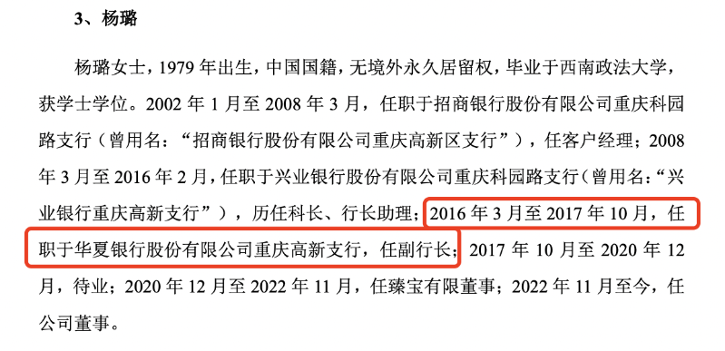 资料显示,杨璐,女,1979年出生,中国国籍,无境外永久居留权,毕业于西南政法大学,获学士学位。2002年1月至2008年3月,任职于招商银行股份有限公司重庆科园路支行(曾用名:“招商银行股份有限公司重庆高新区支行”),任客户经理;2008年3月至2016年2月,任职于兴业银行股份有限公司重庆科园路支行(曾用名:“兴业银行重庆高新支行”),历任科长、行长助理;2016年3月至2017年10月,任职于华夏银行股份有限公司重庆高新支行,任副行长;2017年10月至2020年12月,待业;2020年12月至2022年11月,任臻宝有限董事;2022年11月至今,任公司董事。