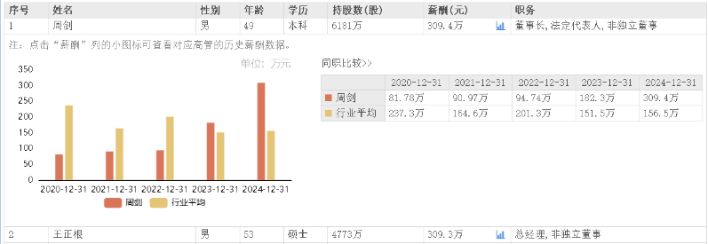 据东方财富网数据,迈为股份董事长周剑2024年领薪309.4万元,相较上年薪酬182.3万元涨薪69.72%;总经理王正根2024年领薪309.3万元,相较上年薪酬133.9万涨薪130.99%。