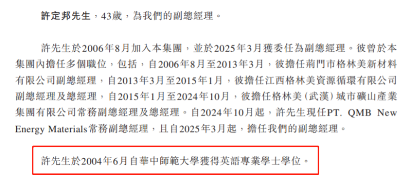 自2024年10月起,许定邦现任PT.QMB New Energy Materials常务副总经理,且自2025年3月起,担任公司的副总经理。