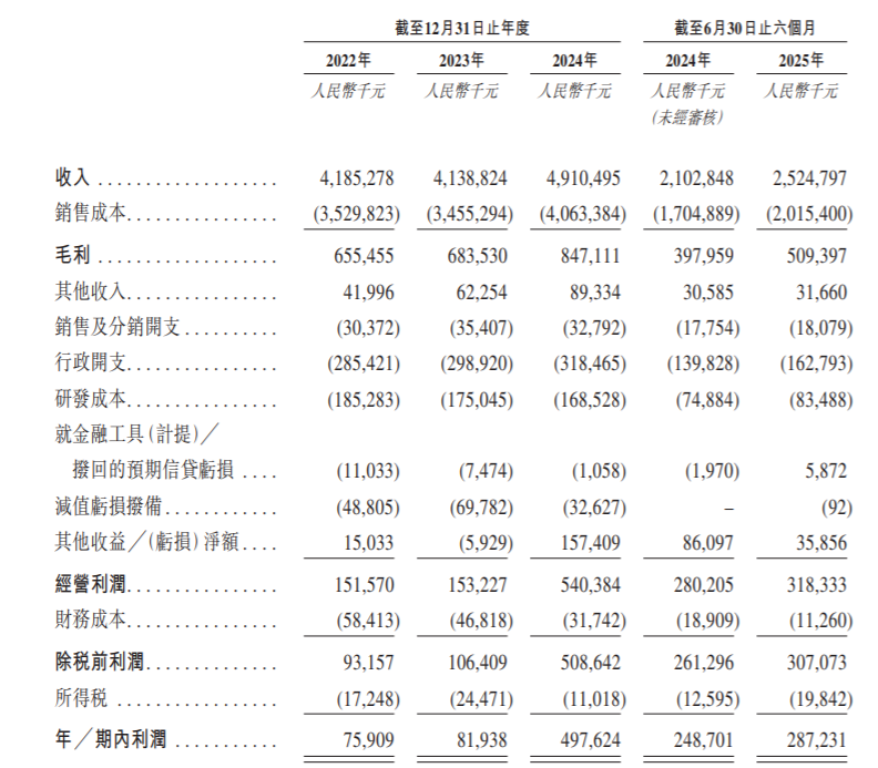 业绩方面,于2022年度、2023年度及2024年度,双林股份实现收入分别为约41.85亿元、41.39亿元及49.10亿元;同期,年/期内利润分别为7590.9万元、8193.8万元及约4.98亿元。