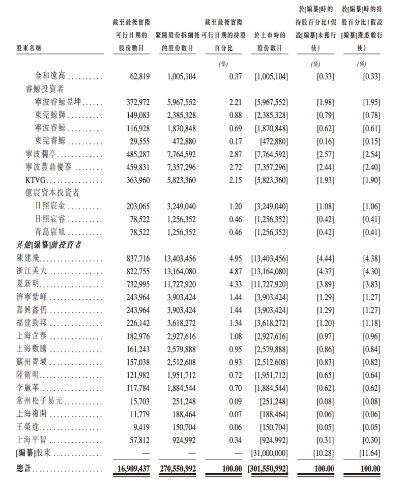 此外,恒耀持股11.61%,大陆投资(中国)持股3.3%,徐州产发持股3.2%,金浦投资者持股2.23%,融玺投资者持股2.16%,南通疌盛持股1.15%,和高投资者持股4.24%,睿鲸投资者持股3.95%,宁波澜亭、宁波丰鼎优泰分别持股2.87%、2.72%,KTVG持股2.15%,亿宸资本投资者持股2.12%,浙江美大持股4.87%。