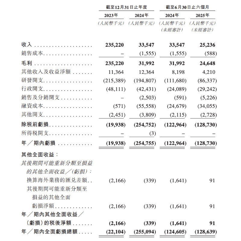 于往绩记录期间,英派药业的收入来源于对外许可收入及销售医药产品。2023年、2024年,英派药业收入分别为2.35亿元、3354.7万元,期内全面亏损总额2210.4万元、2.55亿元。
