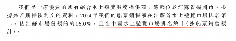 根据弗若斯特沙利文数据,于2024年,瘦西湖在江苏省水上游览服务市场的船票销售额方面排名第二,约占江苏省市场份额的16.0%,且在中国水上游览市场排名第十(按船票销售额计)。