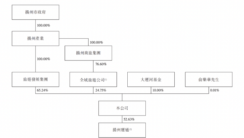 最后实际可行日期,扬州市政府旗下旅游发展集团、全域旅游公司合计持股约89.99%,为控股股东。江苏国资基金大运河基金持股10%。俞乐华持股0.01%。