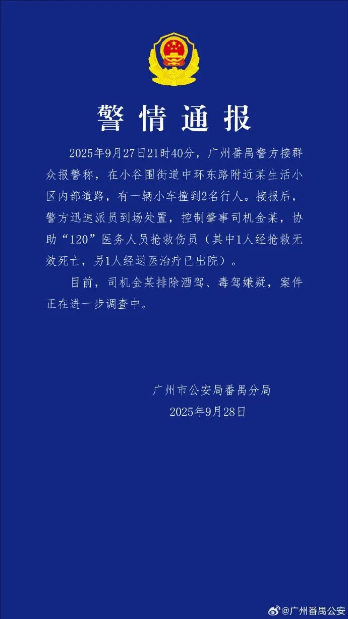 据澎湃新闻,广州市公安局番禺分局昨(28日)晚通报一宗交通事故:9月27日晚9时40分,广州番禺警方接群众报警称,在小谷围街道中环东路附近某生活小区内部道路,有一辆汽车撞到2名行人。接报后,警方迅速派员到场处置,控制金姓肇事司机,医务人员抢救中证实,1人抢救无效死亡,另1人经送医治疗已出院。目前,肇事的金姓司机排除酒驾、毒驾嫌疑,案件正在进一步调查中。