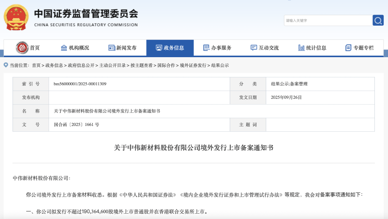 近日,中伟新材料股份有限公司(以下简称“中伟股份”)赴港IPO获中国证监会备案,公司拟发行不超过190,364,600股境外上市普通股并在香港联合交易所上市。