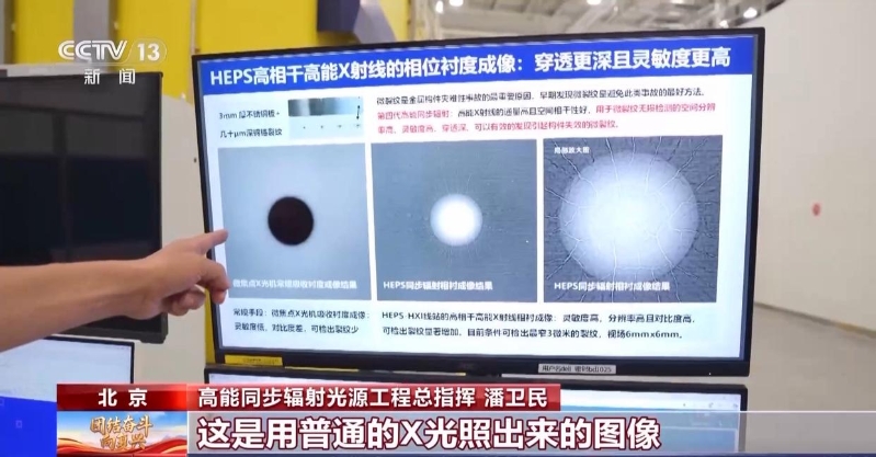 高能同步辐射光源工程总指挥潘卫民介绍,现在高能同步辐射光源已经开始进行光学实验了。3毫米的不锈钢板,相较于普通X光照出的图像,用高能光源照出来的裂纹非常清晰。体现了第四代光源清晰度的性能水平,为今后的实验奠定了重要的基础。