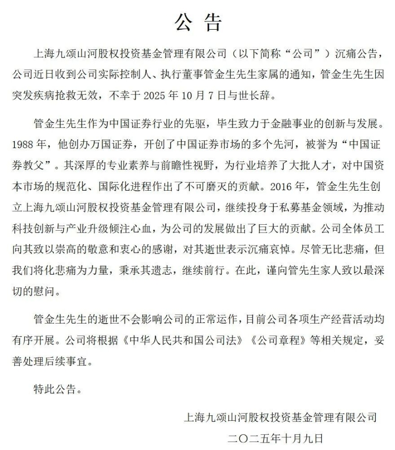 10月9日深夜11点,上海九颂山河股权投资基金管理有限公司(以下简称九颂基金)发布公告称,公司实际控制人、执行董事管金生先生家属的通知,管金生先生因突发疾病抢救无效,不幸于2025年10月7日与世长辞。