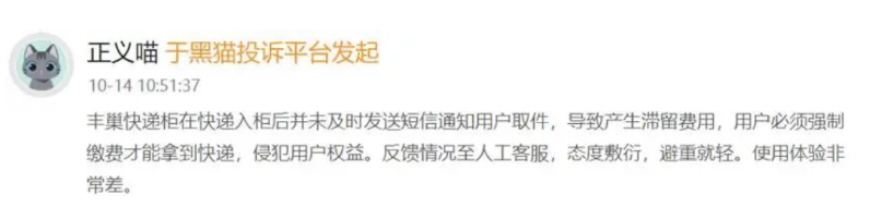 一位网友表示,丰巢快递柜在快递入柜后,并未及时发送短信通知用户取件,导致产生滞留费用,用户必须强制缴费才能拿到快递。