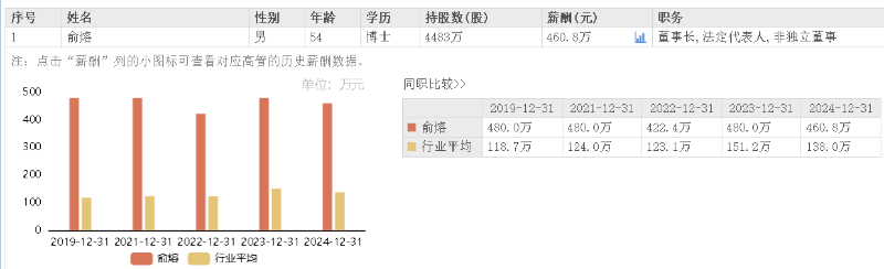 据东方财富网数据,董事长俞熔2021-2024年分别领薪480万、422.4万、480万和460.8万元,四年合计领薪1843.2万元。