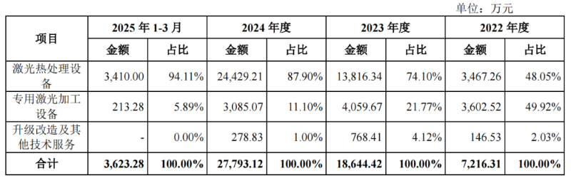 其中,激光热处理设备收入占比从2022年的48.05%升至2025年一季度的94.11%,同时,专用激光加工设备收入占比由49.92%骤降至5.89%。