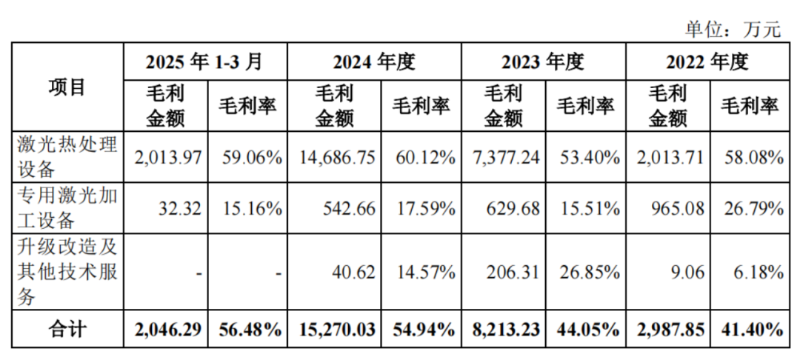 高毛利率水平主要靠激光热处理设备业务撑起,以2025年一季度为例,激光热处理设备毛利率高达59.06%,而专用激光加工设备毛利率仅有15.16%。