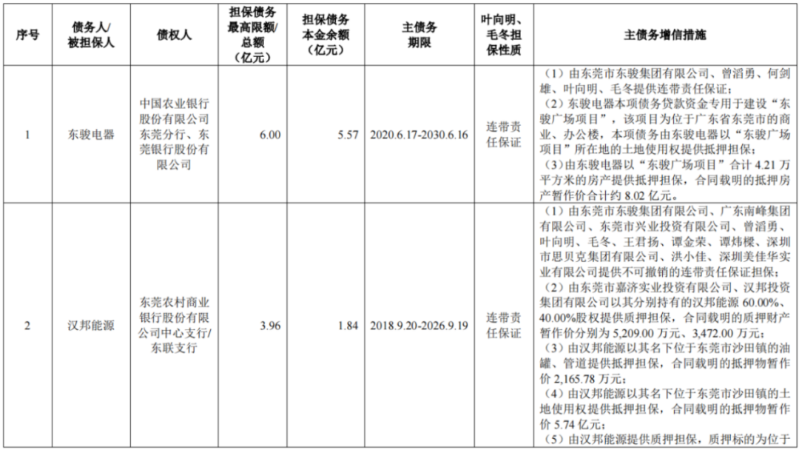 截至递表前,公司实控人叶向明和毛冬存在大额对外担保情形,其对东骏电器、汉邦能源等其控制企业以外的第三方提供的担保债务本金余额为7.41亿元,其中东骏电器担保债务本金余额5.57亿元、汉邦能源担保债务本金余额1.84亿元。