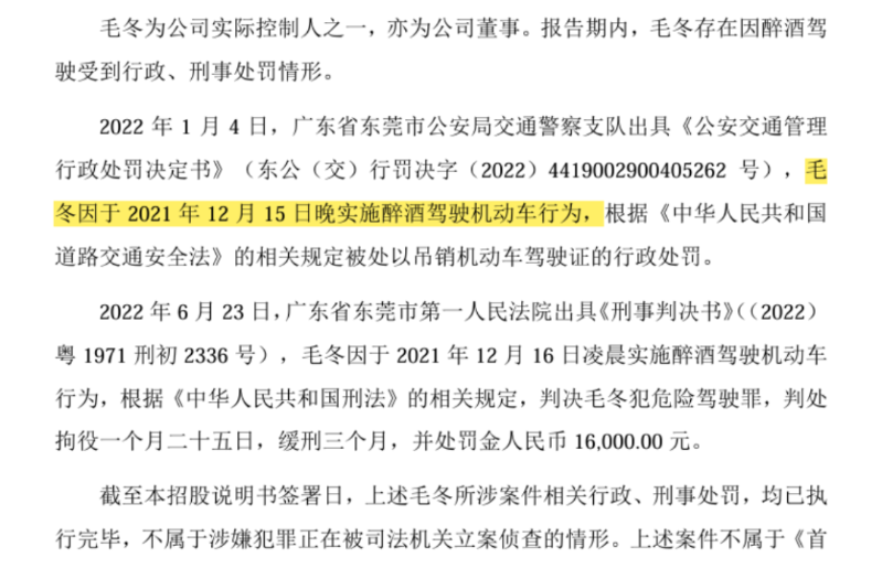 此外,毛冬还曾因醉酒驾驶受到行政、刑事处罚。2021年12月15日晚,毛冬因醉驾被吊销机动车驾驶证,并判处拘役一个月二十五日,缓刑三个月,并处罚金1.6万元。