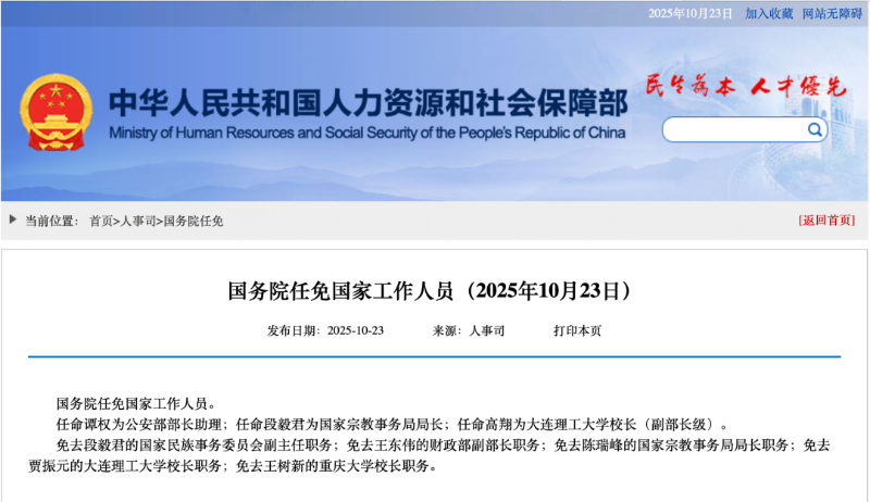10月23日,人力资源社会保障部网站发布消息,国务院任免国家工作人员。
