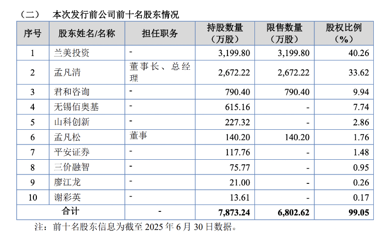 此外,无锡佰奥基持股7.74%,山科创新持股2.86%,孟凡清弟弟孟凡松持股1.76%,平安证券持股1.48%,三价融智持股0.95%。