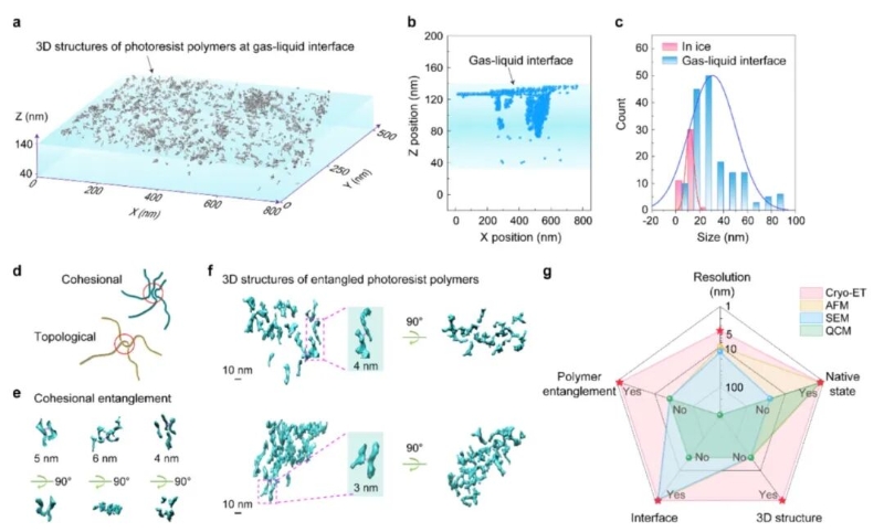 该技术带来诸多新发现。论文通讯作者之一、北京大学化学与分子工程学院高毅勤教授介绍,以往业界认为溶解后的光刻胶聚合物主要分散在液体内部,然而三维图像显示它们大多吸附在气液界面;团队还首次直接观察到光刻胶聚合物的“凝聚缠结”,其依靠较弱的力或者疏水相互作用结合;而且,吸附在气液界面的聚合物更易发生缠结,形成平均尺寸约30纳米的团聚颗粒,这些“团聚颗粒”正是潜在的缺陷根源,它们容易沉积到精密的电路图案上,让本该分开的电路连在一起。