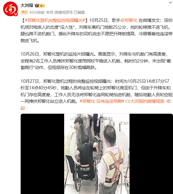 10月25日下午,歌手郑智化在微博发文,称深圳机场对残疾人的态度没人性,升降车离机门地板25公分,他的轮椅推不进飞机,腿也跨不进机舱门,操纵升降车的司机完全不愿把升降板提高,冷眼看着他连滚带爬进飞机。