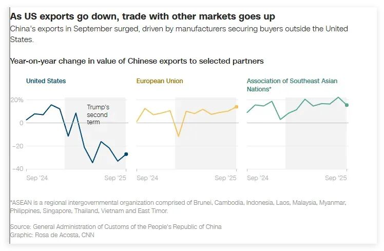 CNN称,虽然中国对美国的出口额随着特朗普第二个任期的到来同比出现下降,但中国与其他市场的贸易同期都在增加,这也令中国在对美出口总额同比下降的情况下,今年截至9月的出口总额仍实现了6.1%的增长。