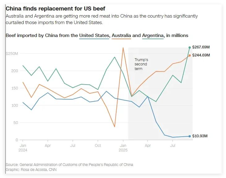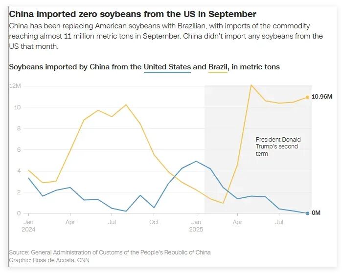 其中,美国有线电视新闻网(CNN)就在一篇11月2日的文章中,引用中国海关总署的官方数据制作了4张简单的图表,并以此直观地呈现出了两个大国在博弈时,发生了哪些变化。