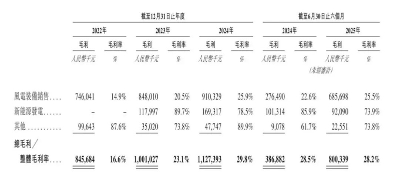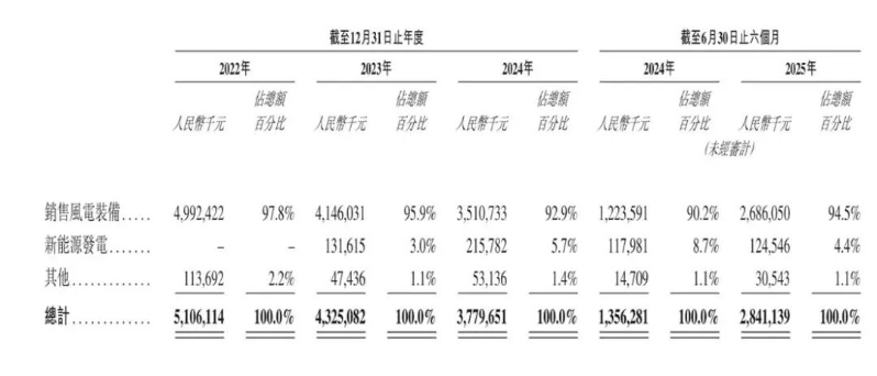 大金重工核心的收入来源仍是风电装备,各期业务收入占比总收入的97.8%、95.9%、92.9%及94.5%。2023年起,新能源发电业务开始为大金重工创造收入,2023年-2025年上半年分别贡献了3.0%、5.7%及4.4%的收入。