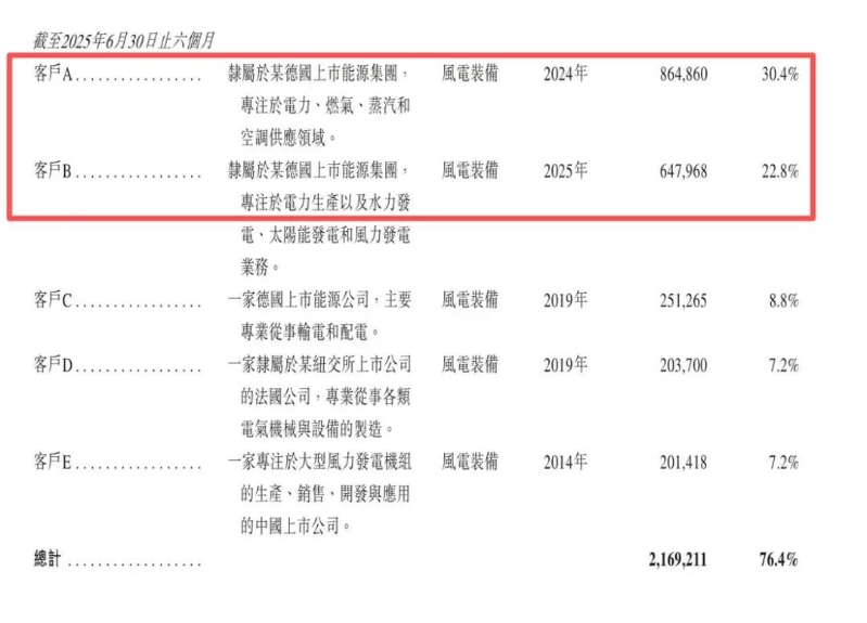 客户A为大金重工2025年上半年的最大客户,期内贡献销售额8.65亿元。其与大金重工是2024年建立的合作,当年贡献销售额6.58亿元。而今年上半年,向客户A的销售金额已经超过2024年全年。