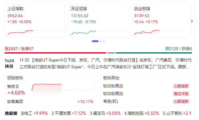 11月5日消息,指数低开高走,沪指、创业板指双双拉升翻红。截至午间收盘,沪指报3962.04点,涨0.05%;深成指报13155.62点,跌0.15%;创指报3139.53点,涨0.17%。