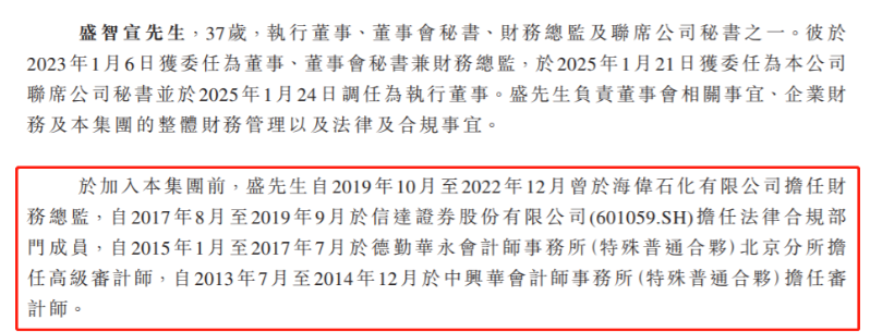 于加入集团前,盛智宣自2019年10月至2022年12月曾于海伟石化有限公司担任财务总监,自2017年8月至2019年9月于信达证券股份有限公司(601059.SH)担任法律合规部门成员,自2015年1月至2017年7月于德勤华永会计师事务所(特殊普通合伙)北京分所担任高级审计师,自2013年7月至2014年12月于中兴华会计师事务所(特殊普通合伙)担任审计师。
