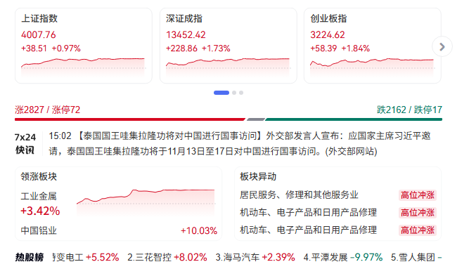 11月6日消息,市场全天震荡走强,三大指数高开高走,沪指涨近1%,重回4000点上方。截至收盘,沪指报4007.76点,涨0.97%;深成指报13452.42点,涨1.73%;创指报3224.62点,涨1.84%。