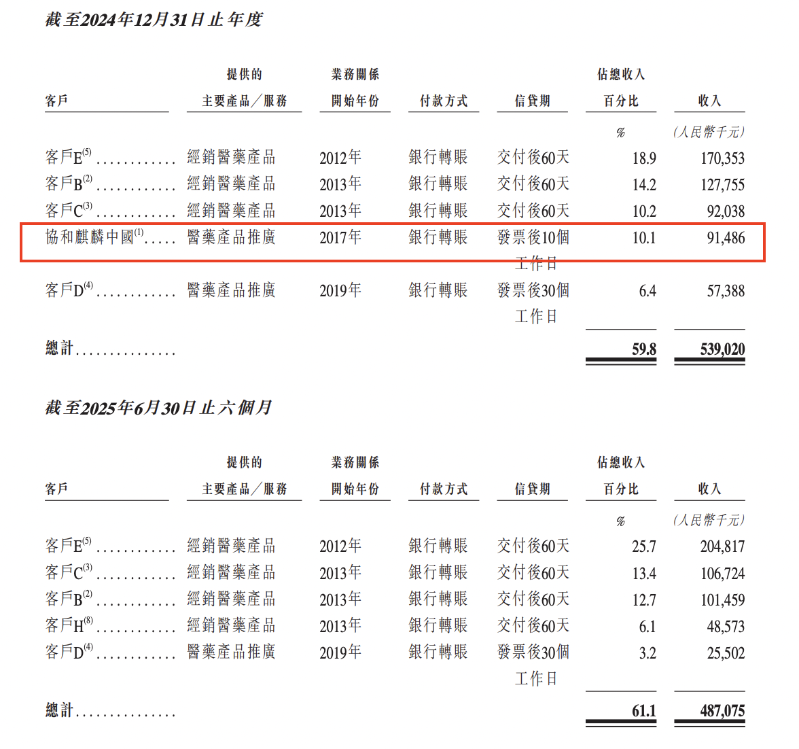维健医药的主要客户包括从事向医院、药房及其他终端渠道配送公司产品组合中医药产品的经销商;及委聘公司以CSO模式提供推广服务的制药公司。值得注意的是,2024年9月,维健医药收购了协和麒麟中国。收购后,公司最大的推广服务客户协和麒麟中国成为公司的全资子公司,不再属于第三方客户。