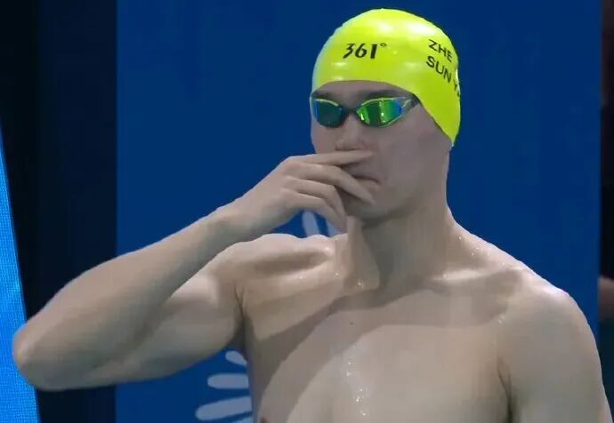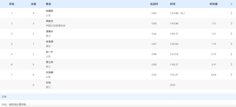 本场比赛,孙杨的成绩位列第八,显示DSQ(被取消比赛资格)。