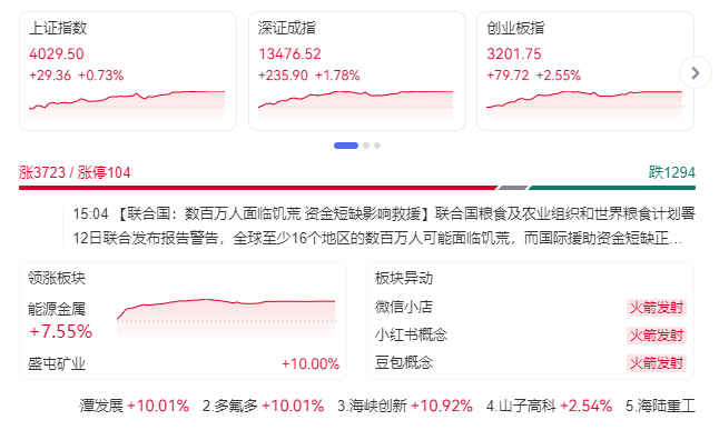 11月13日消息,市场全天震荡走强,沪指收涨0.73%刷新十年新高。截至收盘,沪指报4029.50点,涨0.73%;深成指报13476.52点,涨1.78%;创指报3201.75点,涨2.55%。