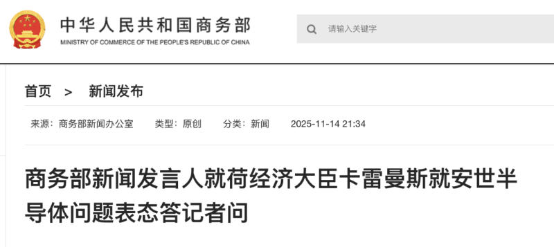 11月14日,商务部新闻发言人就荷经济大臣卡雷曼斯就安世半导体问题表态答记者问。