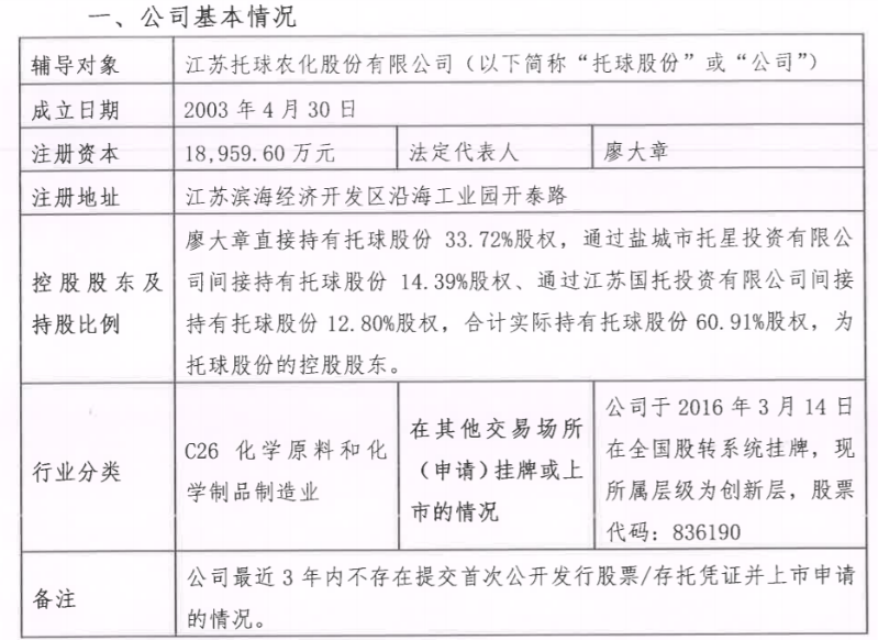 11月13日,江苏托球农化股份有限公司(以下简称“托球股份”)在江苏证监局启动IPO辅导,拟北交所上市,辅导机构为太平洋证券。