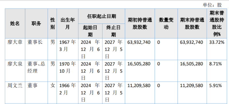 具体来看,廖大章弟弟廖大泉持股8.71%,廖大章配偶周文兰持股5.91%。廖大章担任董事长,廖大泉担任董事、总经理,周文兰任董事。
