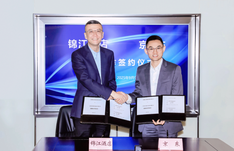 ▲京东与锦江酒店签署战略合作协议,画面中右边人物为郭庆。 图源:锦江酒店