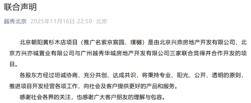 11月16日晚间,中建智地与越秀地产、金茂等联合发布声明,称已就北京朝阳区黄杉木店地块的营销纠纷达成共识。