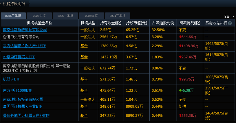 埃斯顿三季报显示,股东总人数连续两个季度下降,截至9月30日,为11.43万户,户均持股从6月末的6304股增至6846股,前十大流通股股东中有7家机构,其中机器人主题基金占5席,代表北上资金的香港中央结算有限公司增持644.66万股,排名第三,易方达国证机器人产业ETF猛增1498.96万股,持股达1789.55万股跃居第四位。