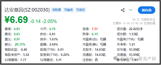 截至11月19日14时,达安基因股价报6.69元/股,跌幅2.05%,总市值93.89亿元;白云山A股(600322.SH)及港股(00874.HK)均表现为股价下跌,其中A股微跌0.79%至26.42元/股,港股股价减少1.69%至19.21港元/股。