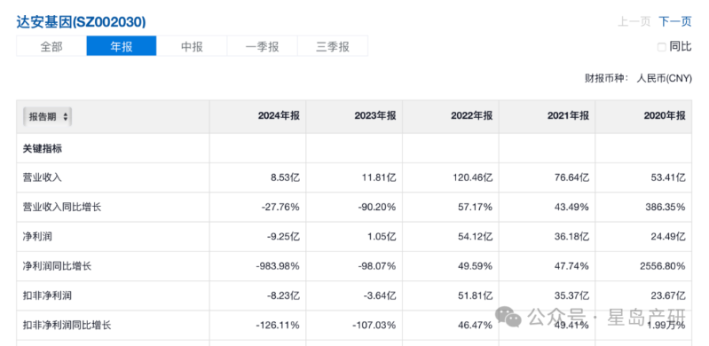 2023—2024年,达安基因营收分别为11.81亿元、8.53亿元,净利润分别为1.05亿元、亏损9.25亿元。