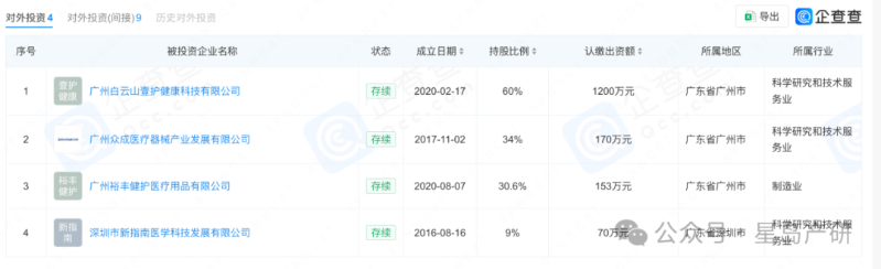 ▲白云山医疗健康产业公司投资子公司情况,来源:企查查