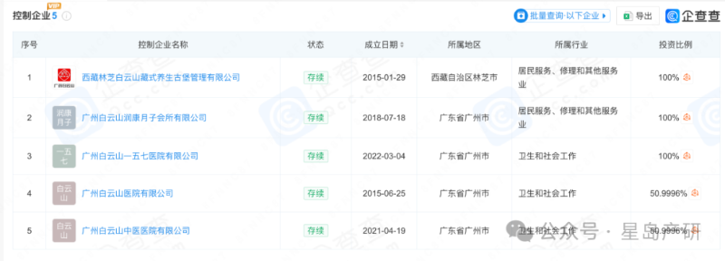 白云山医疗健康产业公司控制的公司则有5家,主要为医院、月子会所、中医养生会所等。