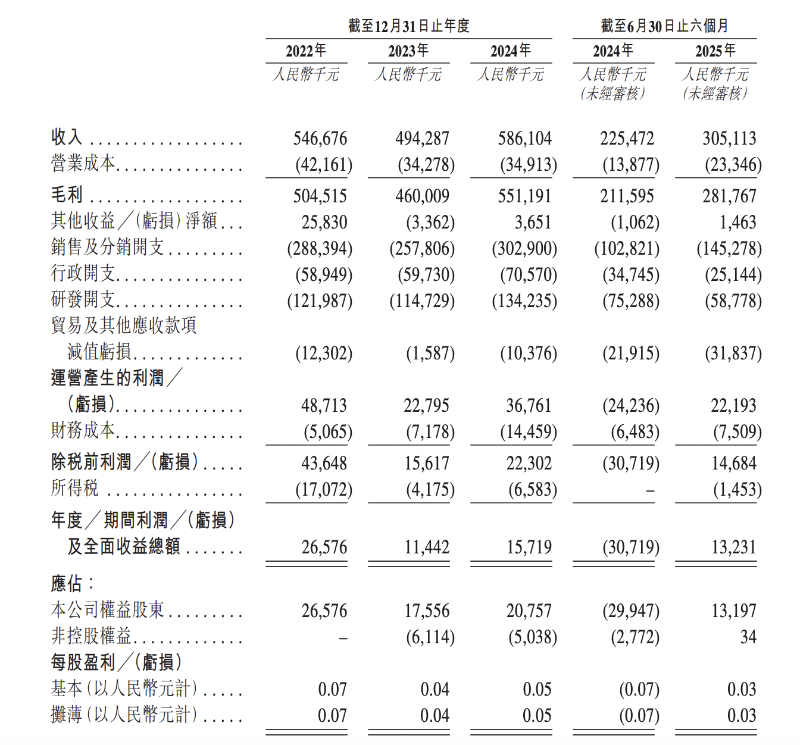 2022年至2024年及2025年上半年,欧林生物收入分别为5.47亿元、4.94亿元、5.86亿元、3.05亿元,年度利润及全面收益总额分别为2657.6万元、1144.2万元、1571.9万元、1323.1万元,毛利率分别为92.3%、93.1%、94.0%、92.3%。